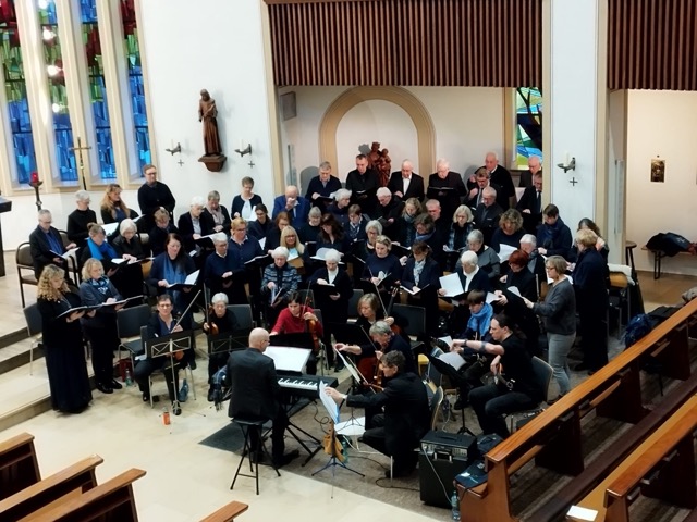 Nach einem Aufruf in der Zeitung und in den sozialen Medien startete der Chor der St. Christophorus Gemeinde zusammen mit dem Chor der Petrusgemeinde und ca. 25 Neusänger und - sängerinnen zu einem Projekt unter der Leitung von Gregor Stewing und Birgit Kreutz. Die Proben fanden abwechselnd im Pfarrzentrum der St. Petrus Kirche und dem Gemeindehaus in Raestrup statt.