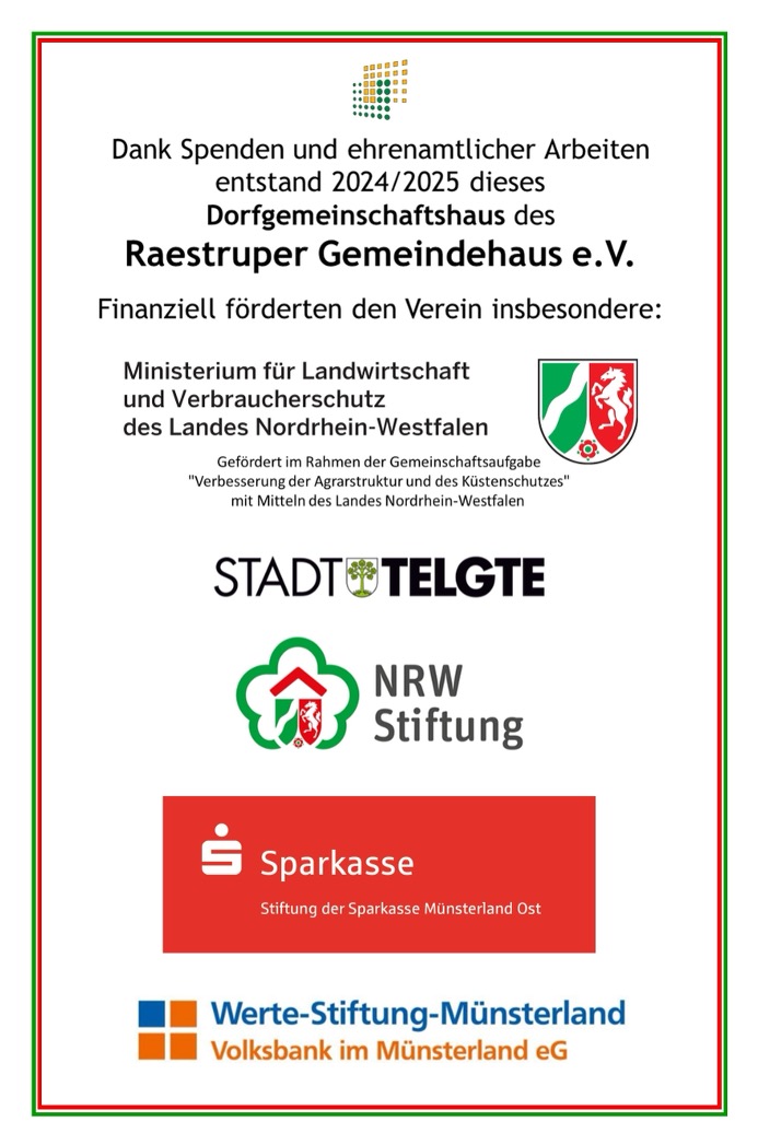 Mit dem Vereinshaus des Raestruper Gemeindehaus e.V. (RGH) entstand ein Ort der Begegnung für alle Raestruper und ihre Nachbarn. Damit schließt sich die langjährige Lücke einer fehlenden Versammlungsstätte. Über 4.000 ehrenamtliche Arbeitsstunden von engagierten Vereinsmitgliedern und Freunden stecken in diesem Gemeinschaftswerk. Das Haus ist ein zentraler Treffpunkt für Feste, Veranstaltungen und für das bürgerschaftliche Engagement!